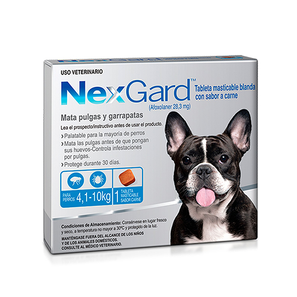 Comprimido masticable que contribuye al control de pulgas y garrapatas, las mata rápidamente y su dosis es mensual..