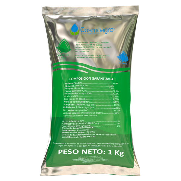 Fertilizante orgánico-mineral altamente hidrosoluble para aplicación al suelo “drench” o mediante sistemas de fertirriego, en etapas iniciales de desarrollo.